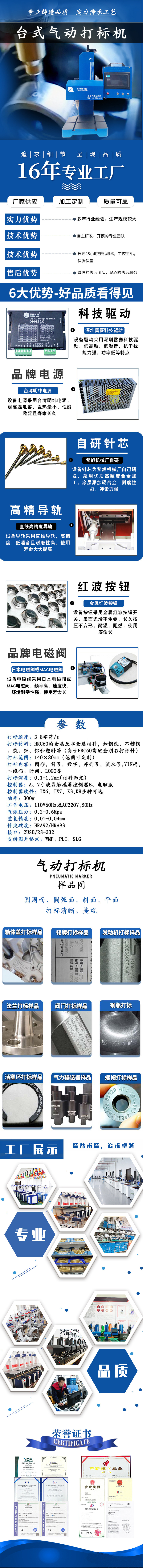 銘牌氣動打標(biāo)機是一款專門針對銘牌打標(biāo)的設(shè)備,該設(shè)備在臺式氣動打標(biāo)機的基礎(chǔ)上加裝手動或氣動銘牌夾具,通過夾具給銘牌定位,免去銘牌左右滑動的困擾,達(dá)到標(biāo)記美觀的效果。