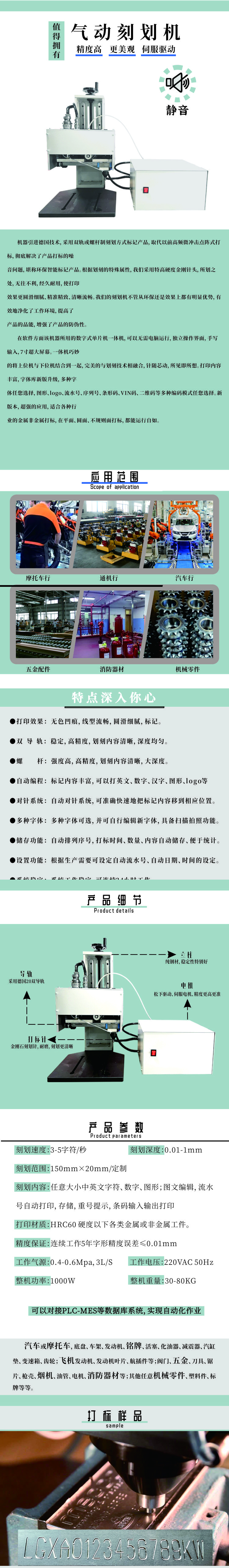 對(duì)于有劃刻深度、無噪音、耐磨損等場(chǎng)合有高要求的用戶,在選擇標(biāo)記產(chǎn)品設(shè)備時(shí),氣動(dòng)刻劃?rùn)C(jī)是不錯(cuò)的選擇。其工作時(shí)噪音小,打印深度可根據(jù)需求自行調(diào)節(jié);并且對(duì)工件表面光潔度沒有要求,刻劃時(shí)線條流暢,劃刻的字符清晰,噴涂處理后拓印效果依然良好,適用于大部分金屬及非金屬工件的打標(biāo)要求。