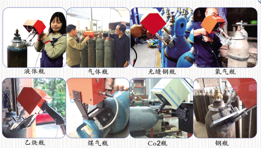 目前主要用于天燃?xì)怃撈?、液化氣鋼瓶、氧氣鋼瓶、氮?dú)怃撈俊⒁胰蹭撈?、鋁瓶、滅火器瓶、民用鋼瓶、液體罐等各種鋼瓶進(jìn)行字符打標(biāo)。
